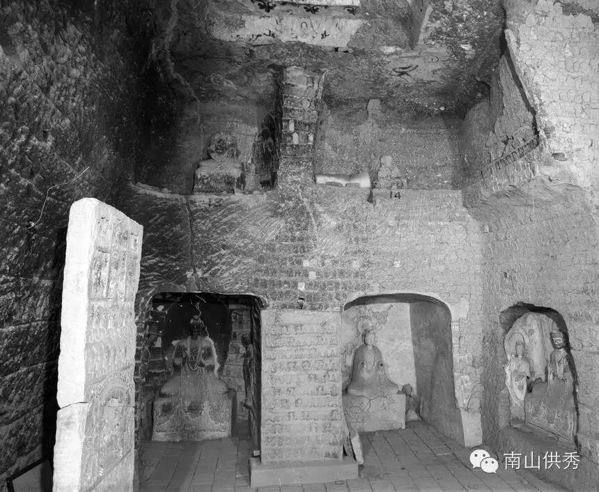 14窟开凿于隋代。为平面方形四角攒尖顶帐形窟。窟大部分塌毁。龛内方形高台座上塑一结跏趺坐佛,低平肉髻,内穿僧祗支,外穿钩钮袈裟。二菩萨扭身侍立于龛外两侧,脚踩圆形仰莲。力士头大脖短,上身袒裸,鼻翼扩张,豹眼怒睁,身体侧弯成弓形。造像手法简洁明朗,概括凝练。