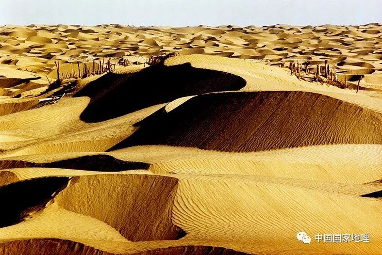 塔克拉玛干沙漠南部,尼雅河尾的三角洲上,坐落着一座失落千年的古城遗址——尼雅古城。1901年,它被英国探险家斯坦因发现,重现世间。茫茫沙海中,隐约可见裸露在外的连片木桩,那是尼雅古城的房屋构架。(图自《中华遗产》2018年03月)