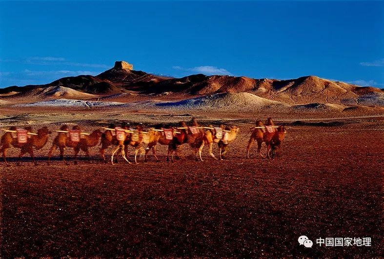 汉武帝时,在帝国疆域最西边设玉门关和阳关,作为西部门户。丝绸之路西出敦煌、由南道通西域,必经阳关。图中是历史学家向达先生考证的阳关故址——甘肃敦煌市南湖古董滩 (摄影 / 吴健)。一支驼队正从有“阳关眼目”之称的墩墩山汉代烽燧前经过。