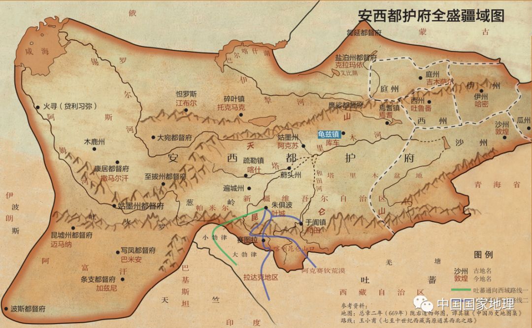 唐初随着一系列战事的胜利,安西都护府的疆域达到极致,最西与波斯接壤。然而青藏高原上的吐蕃也在崛起,并迅速成为唐朝经略西域的最大敌人。 (图自《中国国家地理2018年03月》)