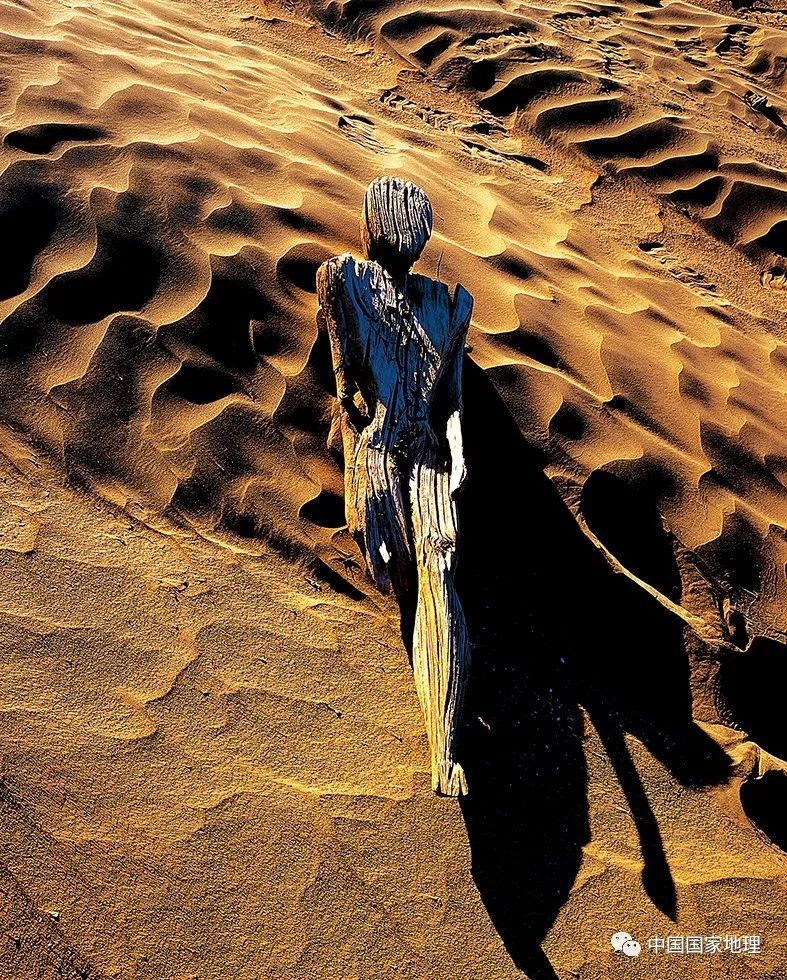 在楼兰小河墓地附近,散落着许多与真人相仿的木头雕像。图中这只浪迹在流沙之中,它生动地勾勒出人体的轮廓:逼真的头部、惟妙惟肖的躯干、浑圆的大腿和矫健的小腿。据考古学家推断,这些木头人可能象征着某种特殊的灵魂,被充当墓地守护神,或作祭祀之用。(摄影 / 刘玉生)