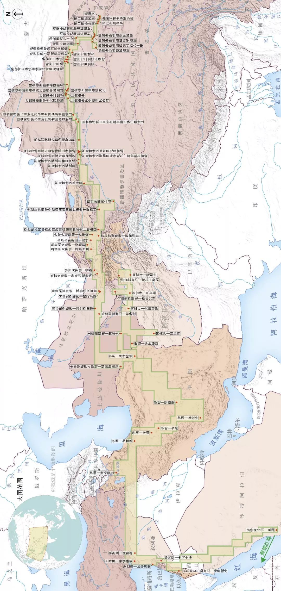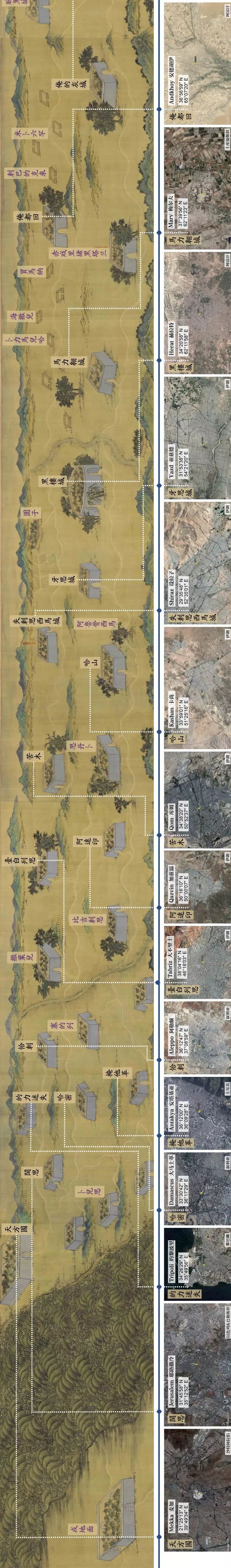 继上篇我们将“丝路山水地图”的中国段考证出来以后,这篇内容我们将这张图国外段的主要城市也做了一遍梳理。虽然还有部分地名没有确认,但已经可以看出一个大致的路线。即以嘉峪关为起点,经塔里木盆地北缘、帕米尔、中亚地区、伊朗高原、两河流域到阿拉伯半岛,最终跨越红海到达非洲大陆。