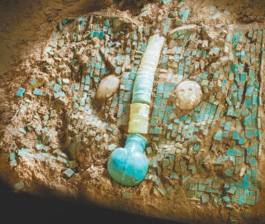 2002年春,在二里头遗址宫殿区的一座贵族墓中出土了一件大型绿松石龙形器,整器长约70厘米。绿松石龙形器和铜铃放置于墓主人骨架之上。全器由2000余片各种形状的细小绿松石片组合而成,每片绿松石的大小仅有0.2—0.9厘米,厚度仅0.1厘米左右。绿松石原来应是粘嵌在木、革之类有机物上。