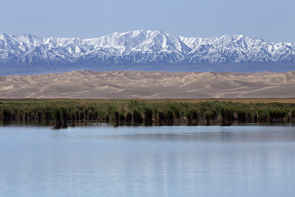 南湖乡的水源属于党河水系。上图中既有雪山、水库,也有沙漠、芦苇丛。自然与人为的合力,使这看似矛盾的神奇景观真实地存在着。