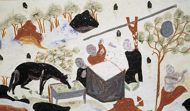 这幅壁画也源自《福田经变》,是佛教中的“造井”,画师绘制时显然参照了当时的生活情景。值得一提的是水井旁边的桔槔(Jié gāo),这是古人提水的工具。井的一侧,一匹马正埋头在水槽里痛饮,另一侧有人提着水罐递给求水喝的行旅人。可以想见,当古人在漫漫戈壁与沙漠围绕的绿洲中,喝到水时的激动心境。