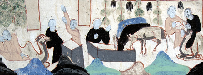 不过,水在敦煌壁画中也不总是以柔美示人,有时也寓意着灾难。上图描绘了当人们落水遇难时,念诵观世音菩萨的名号,得到了观世音菩萨的救助,从而脱离水淹的灾难。