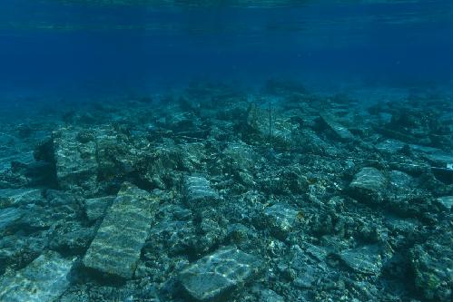 金银岛一号沉船遗址以石质类文物为主要堆积,石质类文物之间还发现有少量陶瓷器碎片。遗址整体分布略呈南北向,分布范围南北长124米、东西宽72米。