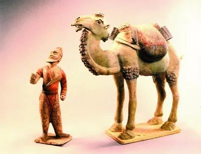 唐太宗昭陵陪葬墓郑仁泰墓出土的牵驼彩釉陶俑,骆驼背上驮着两卷丝绸(陕西省博物馆收藏)。