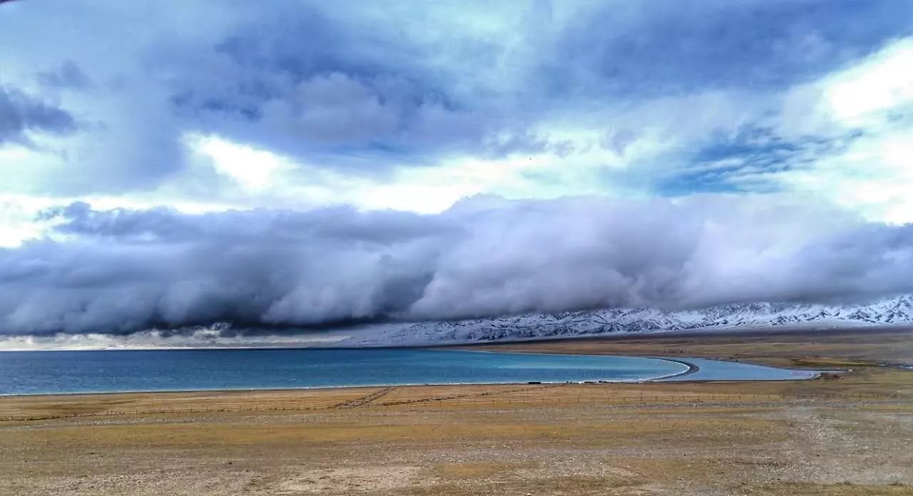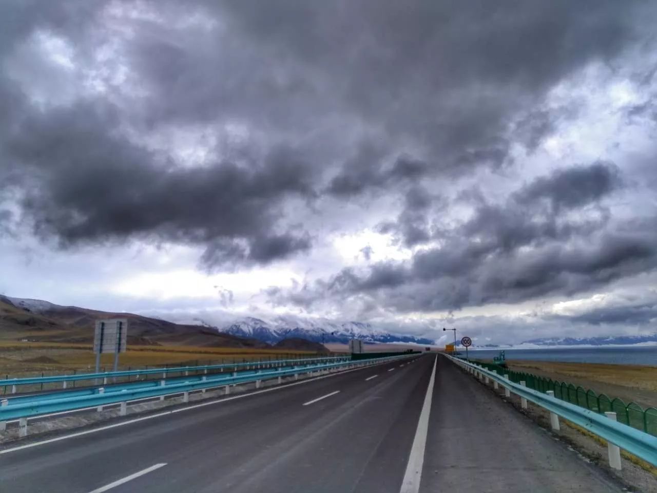 此时平坦笔直的公路延伸向远方,积雪带形成长长的哈达云。苍灰的流云,气势的雪山岩体,麻褐色的草坡,碧绿的湖水,所谓心旷神怡,大抵如此。