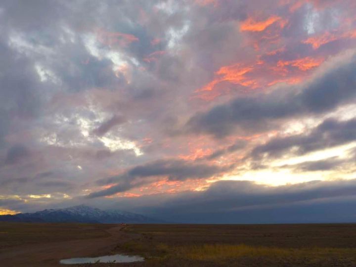 此时夕阳西下,火烧云蔓延天际,远处的雪山静静矗立。没有汹涌人潮,没有拥挤交通,有的只是浑厚的大地,清凉的冷风,驰骋的汽车,和几个热爱自由的行者……