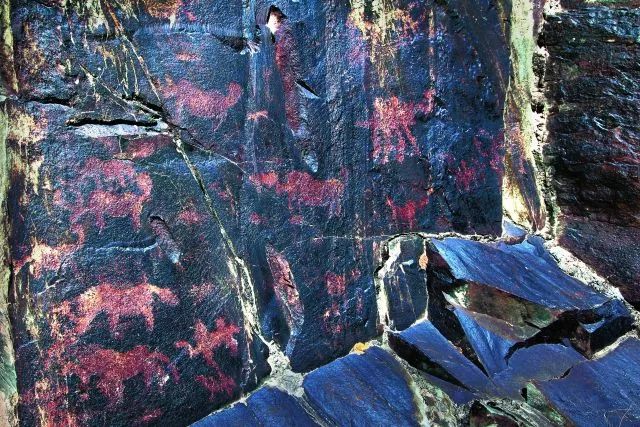 凿刻或涂绘在岩石上的岩画是文字的前身,也是绘画艺术的源泉。岩画在海西多有分布,主要集中在德令哈市、格尔木市、天峻县、都兰县、乌兰县、大柴旦行委等市(县),尤以鲁芒沟岩画、野牛沟岩画、怀头他拉岩画、芦丝沟岩画、卢山岩画等为代表。图上是位于昆仑山玉虚峰下的野牛沟岩画,野牛沟岩画共有5组45幅180个个体形象。透过其简单的艺术形象,我们可以窥察到先民的生产、生活方式甚至伦理观念。