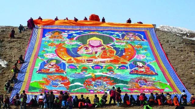 海西是一个多宗教信仰的地区,佛教文化、道教文化、伊斯兰教文化在这里和谐共生。图上所展示的是藏族传统节日晒佛节活动,佛寺将精美的巨幅佛像画布展示在寺院附近的山坡上,供虔诚的信众观瞻叩拜。