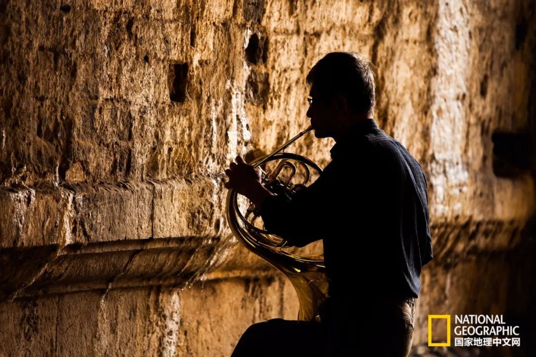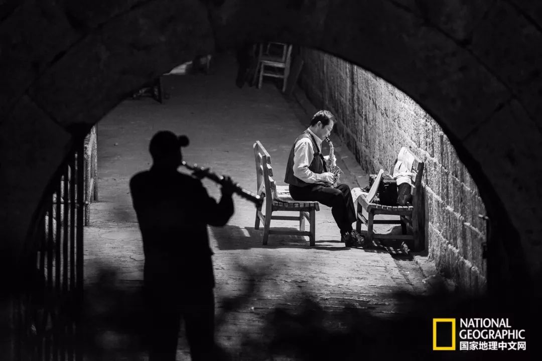 音乐爱好者在中华门瓮城藏兵洞里吹奏萨克斯