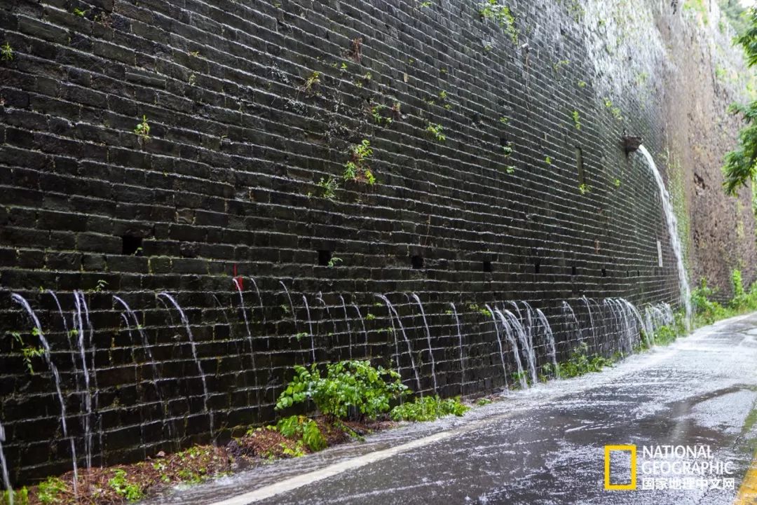 每逢暴雨,南京明城墙龙脖子段就会出现龙吐水,原因是雨水渗入历史悠久的明城墙墙体内,经由其排水系统喷吐而出,形成了独特的“龙吐水”景观。如果没有这些排泄口迅速将城墙内积水排出,水的巨大压力就会将这段城墙顶毁,导致城墙坍塌。