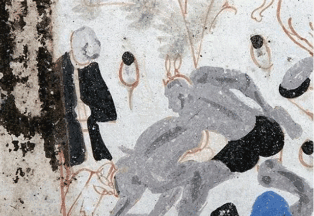 莫高窟第290窟的佛传故事连环画中就描绘了一场紧张的摔跤比赛,为的是体现悉达太子与释迦族年轻人较技时的战无不胜。画面上,两名头扎丱(guan)角髻,下穿兜裆的对手正在一决胜负,旁边还绘有裁判。这幅千年前的画面将摔跤、相扑比赛中讲求技巧和战术形象地表现了出来。看这两位的姿势,左边这位好像已经快输了,被摁在地上摩擦,让人揪心。