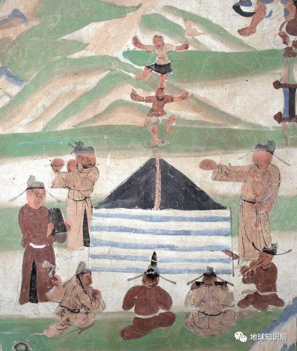 这种杆技在唐代被称为“橦技”,属于百戏之一,是很受欢迎的传统娱乐项目。演员需要经过长年的训练,才能在杆子上保持平衡,演出时更是需要万分小心——那个年代可没有威亚。