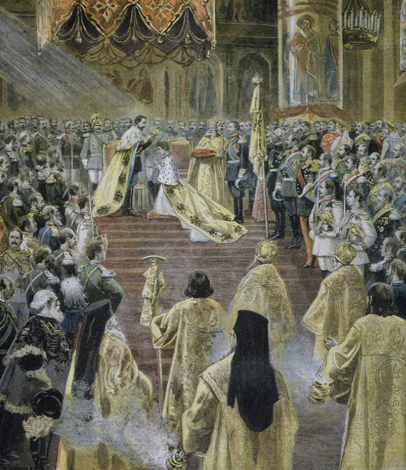 从外表上看,尼古拉二世是位彬彬有礼、见多识广的绅士,但他骨子里是个非常正统的俄国君主。1894年11月14日的加冕典礼充分体现了这种根深蒂固的俄国性:出席仪式的贵族身穿17世纪的传统俄式服装,尼古拉二世本人身穿鲜红色的骠骑兵制服上衣,手里捧着一顶带鸵鸟羽毛的海狸皮帽子,宣誓将坚定地拥护专制制度。