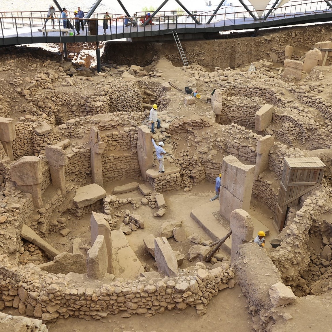 地表下面是由巨石组成的圆圜, 重达20吨的石头被精心雕琢。要知道这些石头在距今1.1万年前,远远早于城市、农业发展或金属制造出现之前,就被安置在此。没有迹象表明这里曾经有人类居住过。到目前为止, 这是我们所知的,地球上出现的第一座寺庙建筑群。她的建造者知道如何搬放和雕刻巨石, 却不懂如何种植农作物以果腹。然而, 这些建造者,应是经过社会性的组织活动聚集于此, 他们成为比当时任何狩猎队伍都要庞大的劳动者群体。