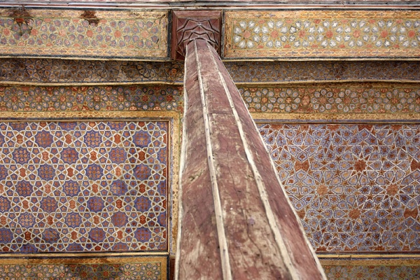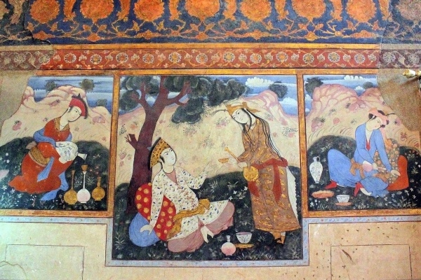 据说,四十柱宫内的所有壁画全部使用天然颜料绘制而成,一些是矿物质颜料,比如活性白土、有色矿泥甚至金粉。一些是西亚特有的诸如胡桃木、茜草这样的草本颜料, 还有一种奇特的动物性颜料。壁画中还会使用纯度相当高的阿什拉菲金,再由阿拉伯胶糅合而成。 经过了细密师的配色,我们才得以看到那些玫瑰红、印度 绿、番红花黄,那些赤橙黄绿青蓝紫的马儿、山丘和天空, 以及永如白昼一样明亮的夜色。