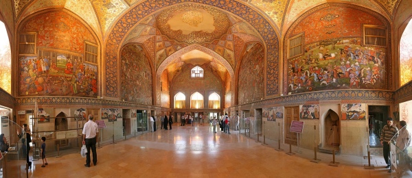 坐标伊斯法罕,眼前这座的四十柱宫建成于1647年。那正是萨法维王朝时期,波斯细密画也到达其巅峰。这个王朝诞生了最杰出且长寿的细密画大师贝赫扎德,他生活的年代也正是欧洲文艺复兴前期。曾有人把他与乔托和波提切利相提并论。