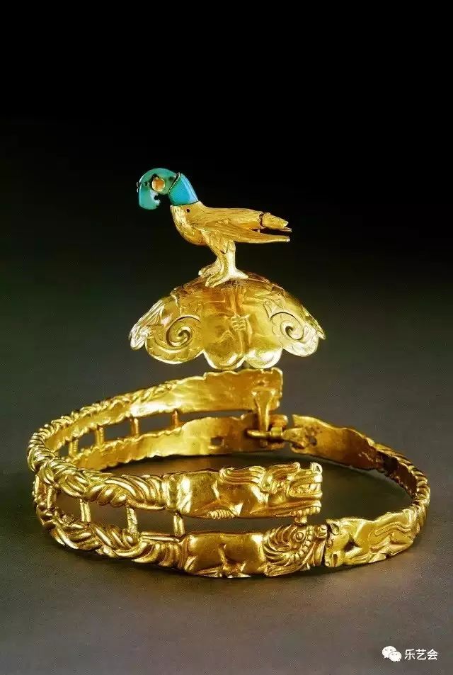 鹰的尾部也是制成后插入鹰的身体的独立活动体。因此整个鹰形金冠不仅金碧辉煌而且动感十足,在略加摇晃或经风吹拂时,雄鹰便会摆动头尾,显示出震翅欲飞的神姿,雄鹰脚下的半圆形球体上,以浮雕的手法表现出一周狼噬咬盘角羊的精美图案,下部冠带由三条半圆形图案带组成,主体部分为绳索纹,相连的两端分别铸造浮雕的虎、马、羊。虎呲牙咧嘴造型凶猛强悍,马、羊则温顺低头俯卧,作温顺之态。