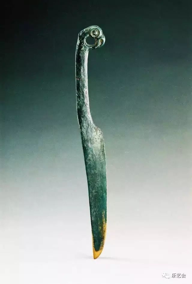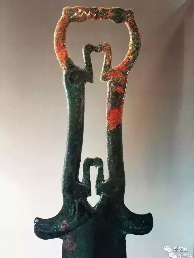 一般来讲,早期的短剑剑柄均装饰为镂空的圆球或者扁球形以及圆雕动物形象,中期“触角式首”短剑柄端的造型多为写实性很强的回首双鸟;晚期短剑柄端的装饰则由抽象的动物进一步简化为双环首或者单环形。