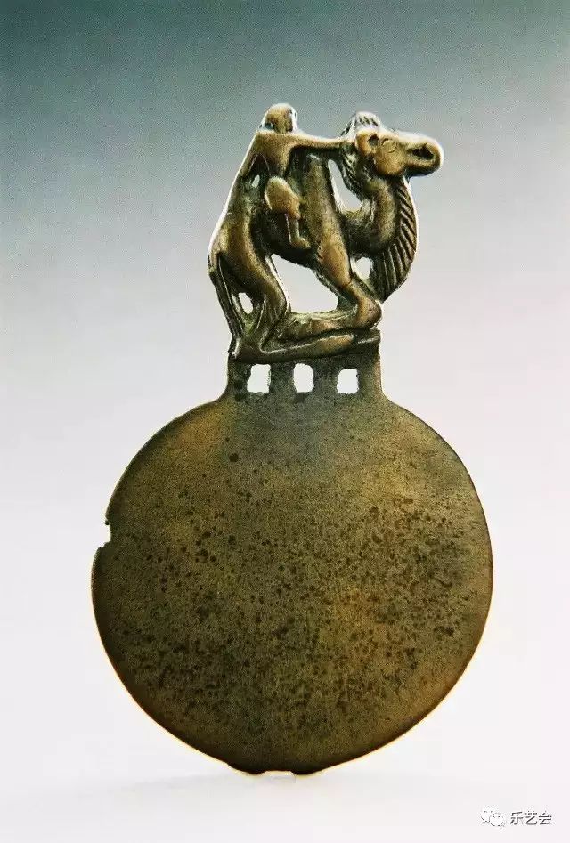 此件铜镜手柄处造型是一胡人骑骆驼的画面,骆驼昂首挺立,其前后肢均处在半卧的状态,再现了丝绸之路上的场景。现藏于鄂尔多斯青铜器博物馆。