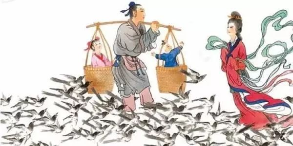 关于牛郎织女最早的表述出现在西周时期,但当时《诗经·小雅·大东》中所提及的仅仅是对织女、牵牛二星作为自然星辰形象引出一种隐喻式的联想,并无任何故事情节。随着时间的推移,才渐渐产生了牛郎、织女的神话形象。本来不相干的两颗星座,因为被注入了人性,成为体现人间感情的夫妻,也逐渐成为民间故事中受人推崇的美好爱情典范。