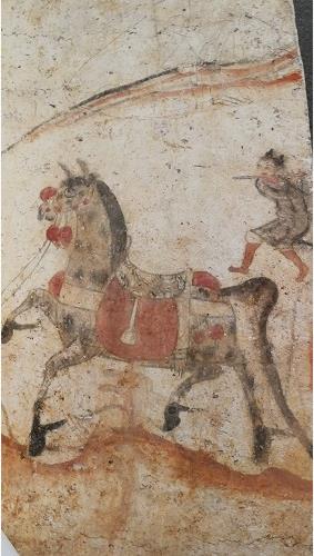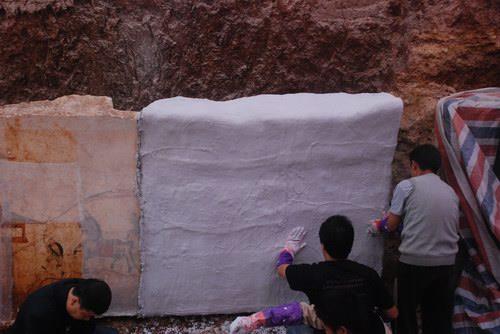 壁画是最脆弱的文物之一,墓葬壁画的结构大致分为基础支撑体、地仗层、画面层三部分,基础支撑体是壁画所依存的岩体、砖石、三合土等基质,在画面和基质之间的是地仗层,根据墓葬规格、基质材料的不同,地仗层有的由粗泥、细泥、白灰泥层层夯实,有的仅有一层白灰泥,这平整的白灰泥就是古代画工们的空白画布。