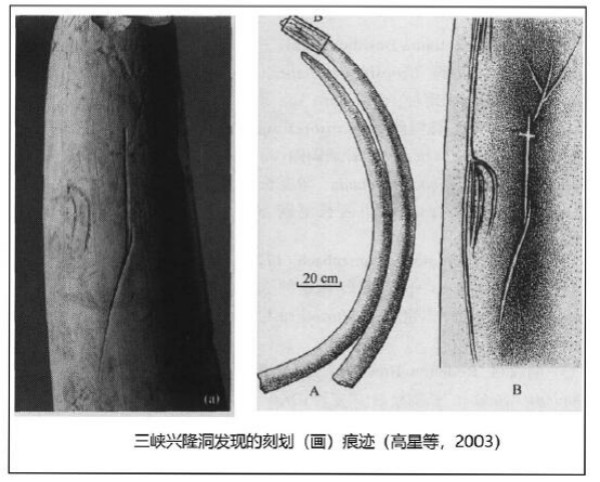 目前我国发现时代最早的与艺术相关的遗物当属15至12万年前,三峡兴隆洞的一件剑齿象门牙上的刻划(画),这些痕迹可以分为两组,一组近似一条灌木枝的图案,另一组近似露鸟的羽冠。这种见于有机质遗物上的原始艺术行为还发现于旧石器时代晚期的北京周口店山顶洞遗址、山西峙峪遗址、北京王府井东方广场遗址、河北兴隆遗址和湖南桂阳的一些骨片和鹿角上。对于这些刻划(画)的意义,很难进行深入解读。而对于这些遗物的功用,裴文中先生认为周口店山顶洞遗址中的一件带有刻划(画)痕迹的鹿角,其功能很可能类似于欧洲旧石器时代晚期遗址中的“指挥棒”。