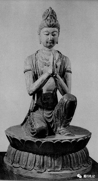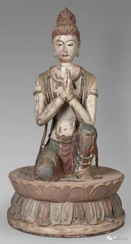 △半跪的供养菩萨,神情虔恭文静,表现了菩萨聆听佛法时,内心的崇拜和敬仰,现藏美国哈佛大学赛克勒博物馆。