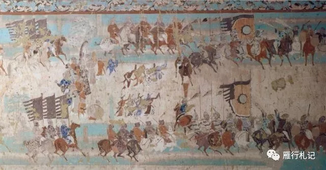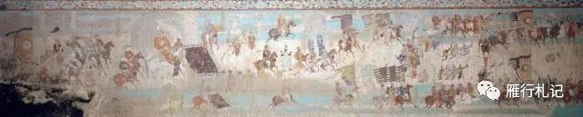 莫高窟第156窟南壁上的《张议潮统军出行图》就再现了张议潮在受到朝廷敕封后出行的盛大场面。 仪仗、马匹、军队,浩浩荡荡又井然有序的被描绘出来,极具威武之势,是莫高窟最早出现的出行图,一幅珍贵的历史画卷。
