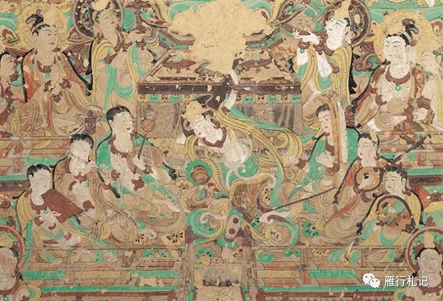 饱满丰腴的面庞,婀娜多姿的体态,紧随律动的舞者乐伎,云间洒落花瓣的飞天,远处华丽的宫殿楼阁,池塘中嬉戏的水禽飞鸟...这一切既是幻想也是现实,是西方净土极乐世界,是大唐最梦幻也最真实的描摹,是属于敦煌莫高窟艺术最辉煌的一个时代。