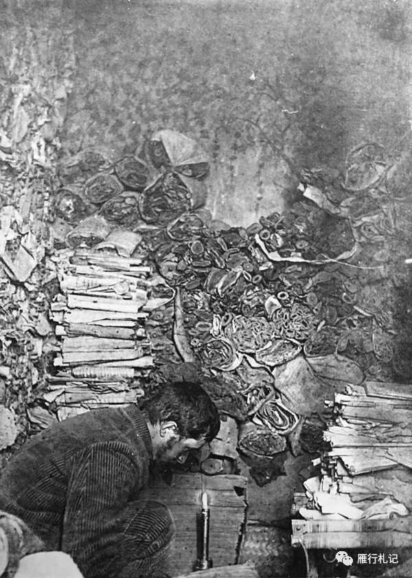 △1907斯坦因年拍摄的莫高窟藏经洞外观和经卷