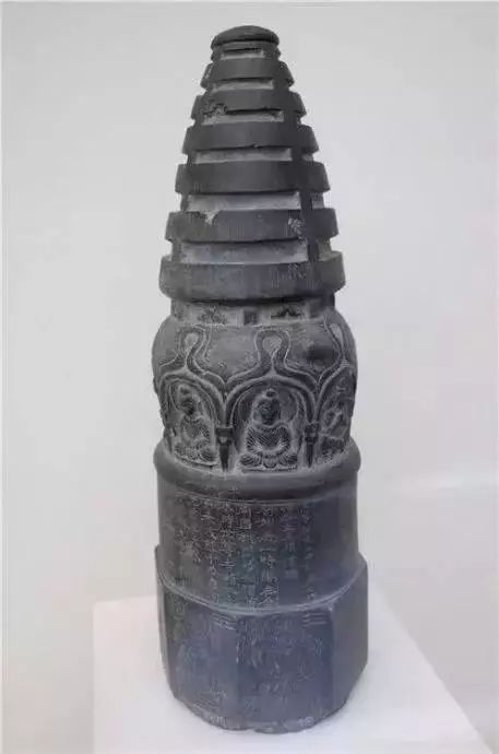 黑色砂页岩质,塔基已佚。基座之上为八面形的塔基,刻出供养菩萨八身,七身立式,一身端坐莲台,各像左侧上角刻有八卦符号。