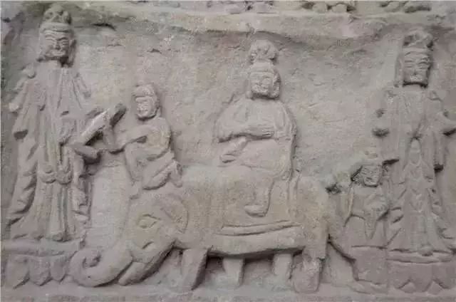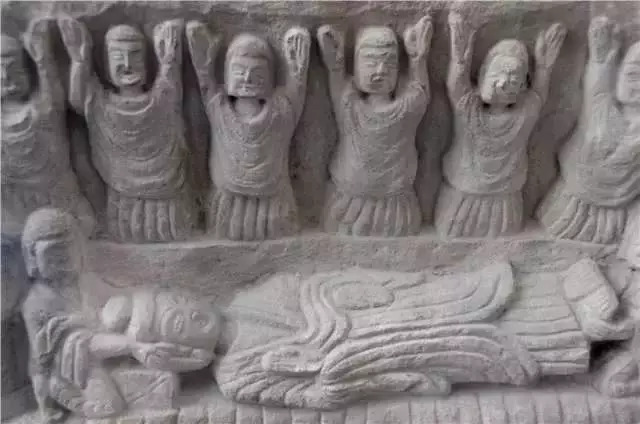 大龛之下七个小龛内雕刻坐佛七尊。坐佛下为10排浮雕千佛,每排30身,共300身。千佛之下依次雕刻供养人立像8身、车马出行图、供养人10深。