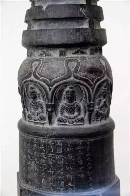 塔基上为圆柱覆钵形塔身,上刻隶书发愿文与经文36行,内容是《增一阿含经·结禁果》中的一段,纪年为承玄元年(428年)。上顶瓶形覆钵,覆钵开八个圆拱龛,七个龛内刻禅定坐佛,一龛内雕交脚弥勒。覆钵之上有七重相轮,顶端宝盖象征天穹,阴刻北斗七星。此塔为现已发现的中国模仿印度覆钵塔的最早实例。