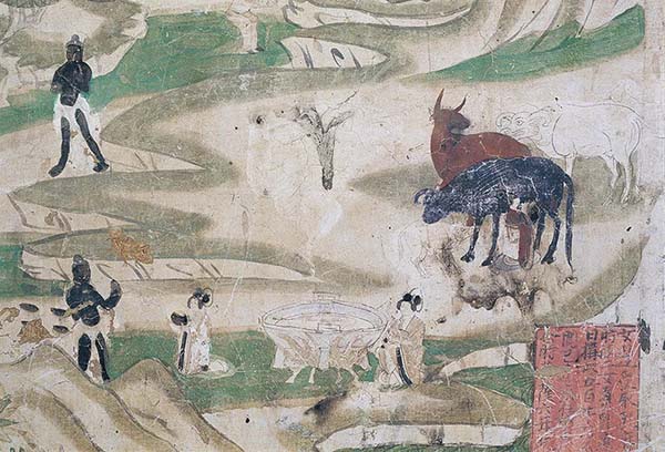 佛陀作为佛教中最重要的导师,自然也最受敬重,壁画中有许多为佛陀供奉各种美食的场景。释迦成佛之前,牧羊女奉上新鲜的乳糜前来供养。