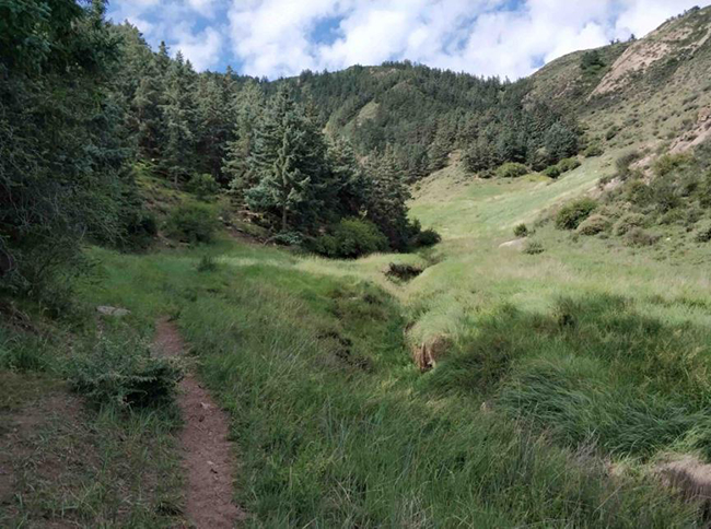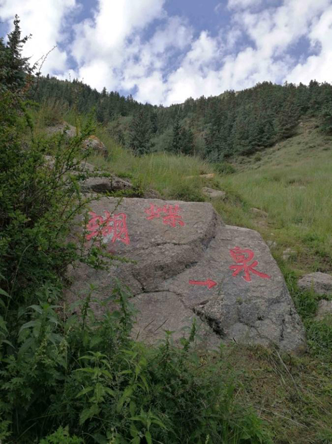 山坡上方还有一眼泉水,即“蝴蝶泉”。为了保护这眼泉水,当地百姓在此盖了一座小庙。泉水缓缓流下,形成一条弯弯曲曲的沟壑。这里的草丛长得如此茂盛,花朵开得如此娇艳,应该与此水源有关(图3)。