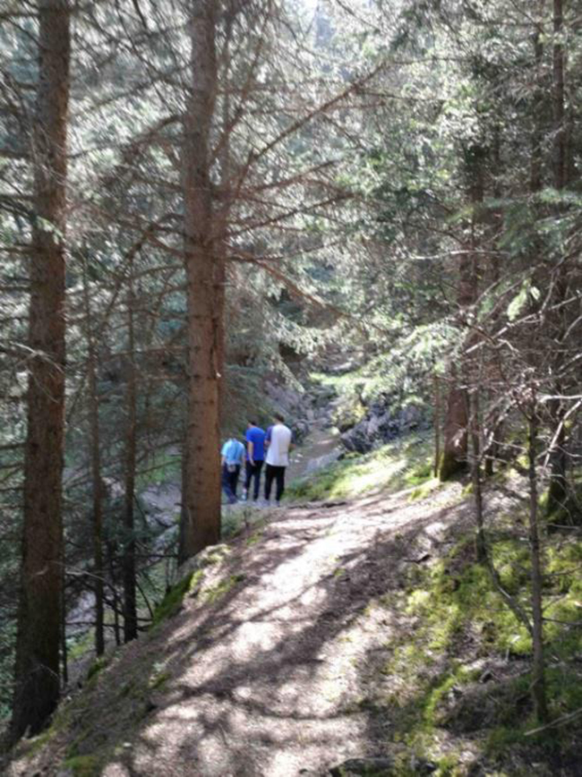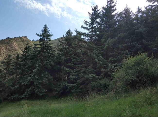天空被笔直挺拔的松树枝条分割成了一绺一绺的蓝绸缎,阳光从树叶的间隙中透射下来,在地上和阴影交织成斑斑驳驳的亮点。突然,一只山鸡扑刺刺的从灌木丛中飞起,霎时林间的静谧被打破。林间偶尔还发现一些野生药用植物,如大黄、黄芪、柴胡等。