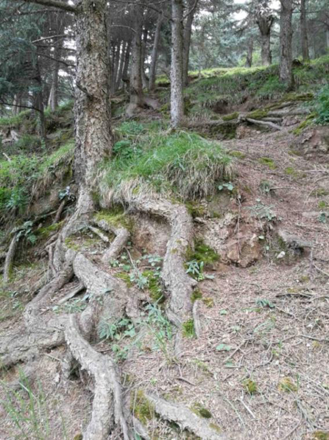 往上走,灌木更多了,松树也越来越多了,我们进入了遮天蔽日的松林里(图4)。大大小小的松树都长得笔直挺拔,其间有的参天苍松看上去至少有两三百年了,根系像虬龙般的纵横交错,深深扎进岩土之中(图5、图6)。此时只听见耳边一阵阵“刷、刷、刷”的松涛声,颇有点“朔风吹,林涛吼,峡谷震荡”的感觉。如果是冬天,则一定是京剧《智取威虎山》中杨子荣唱的“望飞雪 漫天舞 巍巍丛山披银装,好一派北国风光”,更是“山河壮丽 万千气象”。