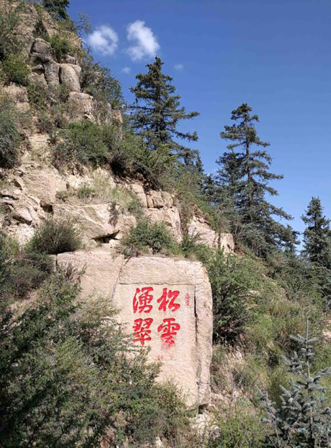 崖壁间一块岩石上刻有“松云涌翠”四个大字,据说是嘉庆年间刻写的(图7),这也就是县志中记载永昌八景中的“云庄铺翠”。清乾隆时,永昌名士南济汉有《游云藏山寺》诗描写此地景色:“绝顶云飞不见峰,云开乍吐玉芙蓉。天临峭壁三千丈,地拔长松千万重。怪石衔楼蹲虎豹,危栏插岸走虬龙。寻幽直到山深处,返向前林已暮钟。”