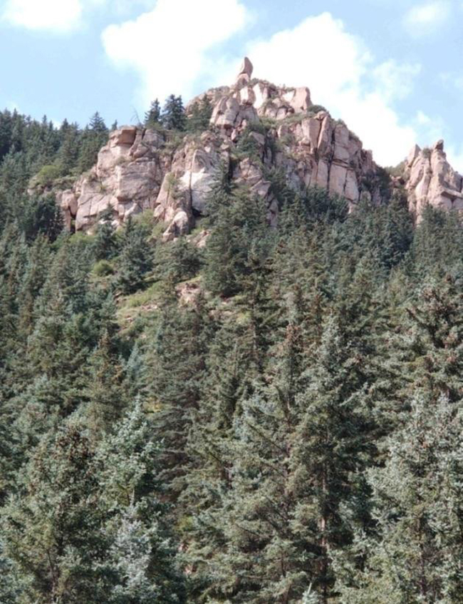 这里的岩石形状确是千奇百怪,造型也正如诗中描写“怪石衔楼蹲虎豹”(图8)。特别是那高耸云霄的莲花峰,亦正是“天临峭壁三千丈”,兀立于四周的群峰之中。这座山峰,其山顶一圈岩石呈花瓣状,形成一朵仰天大莲花,远看俨如新莲初开,仰天怒放。山峰顶端有一竖立的尖石头,远远望去似一把宝剑的剑尖直刺苍穹。移步换景,山峰高耸又似勇士昂首挺立,时时关切地注视着云庄石窟的千年变迁(图9)。