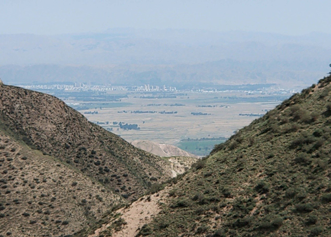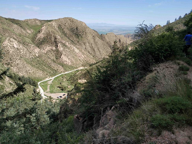 沿着山路爬上了一块平地,这里是天然的观景台。不仅可以更好的观望那峭壁之上的莲花峰,而且俯视山下蜿延的来路就像白色的哈达缠绕云庄山腰(图10),远眺竟然还能隐隐约约看到七八十里之外的永昌县建筑群(图11),而前方则能看到云庄寺石窟的全貌(图12)。