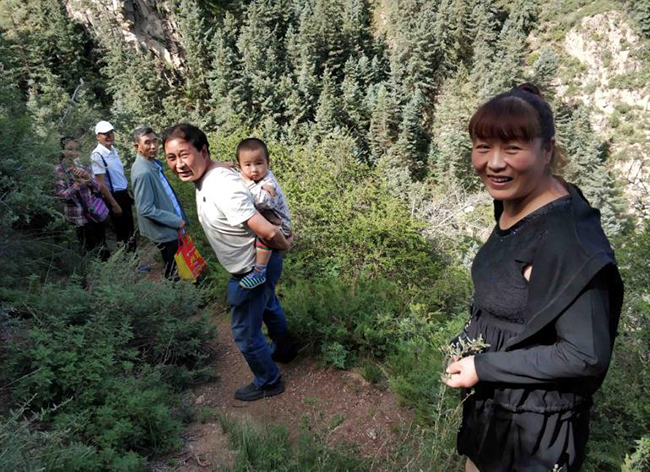 这时,几个当地人从寺庙方向走过来,其中一男人背着一个小孩,看上去像是一家人。他们显然是从另外那条石阶路上山的,到寺庙烧香拜佛后走这条泥土路绕道下山。我们问他们以前来过这里没有,他们说不仅来过,每年都要来好几次呢(图13)。他们的脸上布满了纯朴的笑容,非常灿烂、阳光,这样的神情在城市忙忙碌碌的人群中很难看到,也让我们有所感概。
