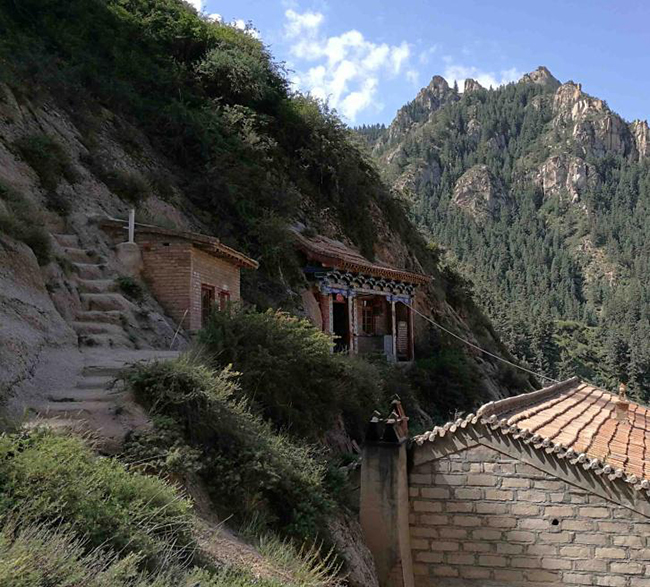 这里确实是修行参禅的好地方,当坐在山崖间的洞窟内打坐禅修,眼看洞外山腰漂浮的云雾,自然会感叹到人生的虚无;攀爬在悬崖栈道之间,难免会联想到人生道路之曲折艰难;穿行在苍劲挺拔的松树林中,默默赞叹它们的顽强;聆听林间泉水叮咚和那一声声鸟鸣,思绪随着声音飘向远方;看着草丛中翩翩飞舞的蝴蝶,感受到生命对自由的渴望;特别是站在崖壁西侧的山巅上,远眺南坝乡一带的田野和永昌县城的房舍,心胸会变得豁达、宽广;看到泾渭分明的郁郁葱葱云庄山和光秃秃的山峦,又不免想到世态炎凉;而当仰望莲花峰和蓝天白云,似乎看到了那遥远而又很近的美丽天堂……