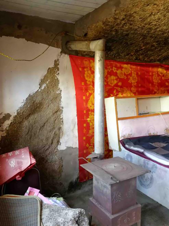 第二层的洞窟有的基本保持原貌(图16),另外有两个被改造为僧房,还有一个被改造为观音殿(图17)。观音殿旁侧的僧房门开着,可以看见这间僧房大约宽3米、深3米、高2米,平顶。从顶部可以看到,这个洞窟实际上原来只有大约2米深。室内放置有一张大床、一张桌子和一个火炉,火炉的烟囱通向左侧室外(图18)。
