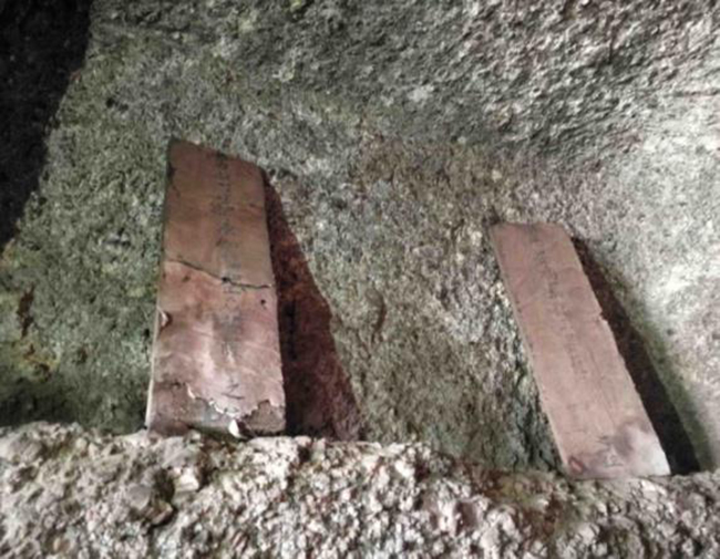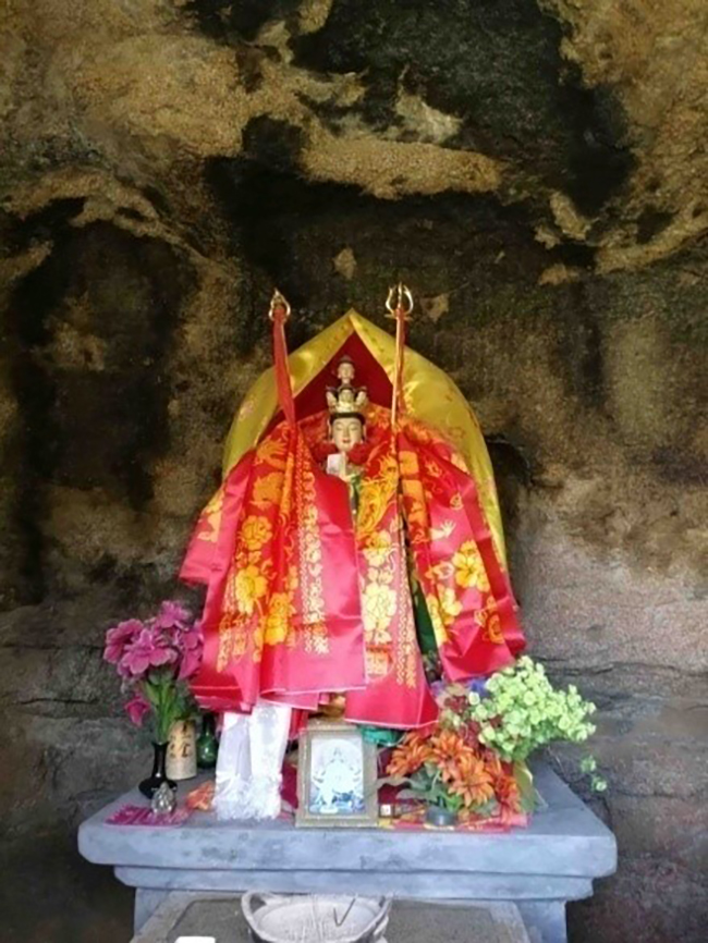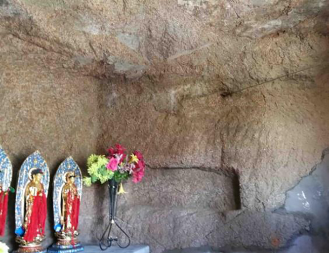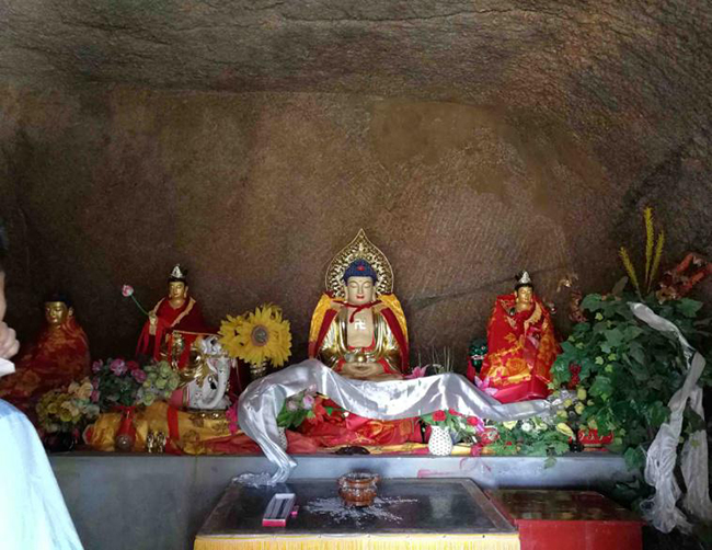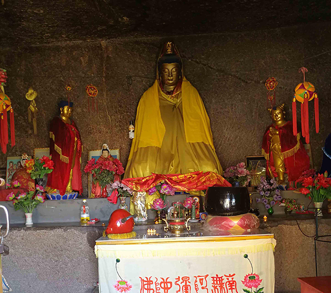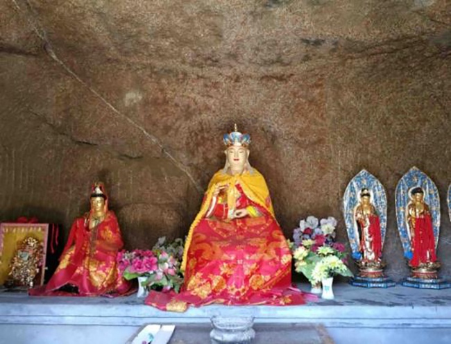 观音殿这个洞窟较大,大约宽4米,深3米多、高3米多,平顶。正壁佛台上有新塑的观音、善财童子等塑像(图19),左侧石壁上有一小龛,龛里放置有两块木板,一块木板上贴纸上用毛笔书写的“当山力士护法伽蓝圣众菩萨 之位”;另一块上贴纸上写有“南无娑竭罗龙王菩萨 之位”(图20、21)。洞窟内已看不到壁画的痕迹。