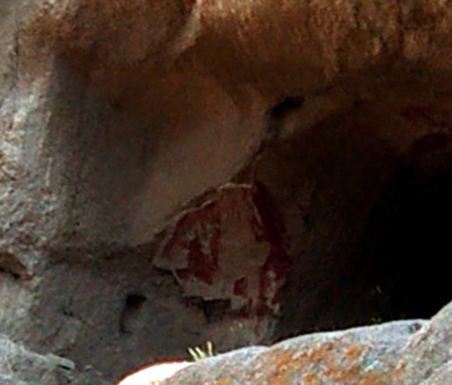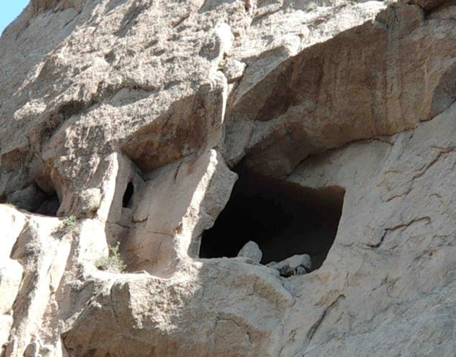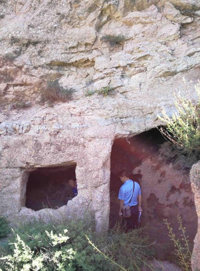 同时也大体可以看到一些破残洞窟的形制,都是平顶,里面也是空无一物(图30、31)。值得注意的是,第四层的一个洞窟的左壁上面还残留有一小块泥皮,泥皮上还残留有不规则的土红色壁画的痕迹,虽然已无法辨识壁画的内容,然而由此可以判断这个洞窟曾经绘有壁画(图32)。遗憾的是,由于我们没有登临到这个洞窟,图片是从下面远处拍摄的,洞窟其他地方是否还存有壁画不得而知。另外,第五层的一个残窟,其形制比较特殊,凿有一外墙,似乎分为前室和后室(图33)。