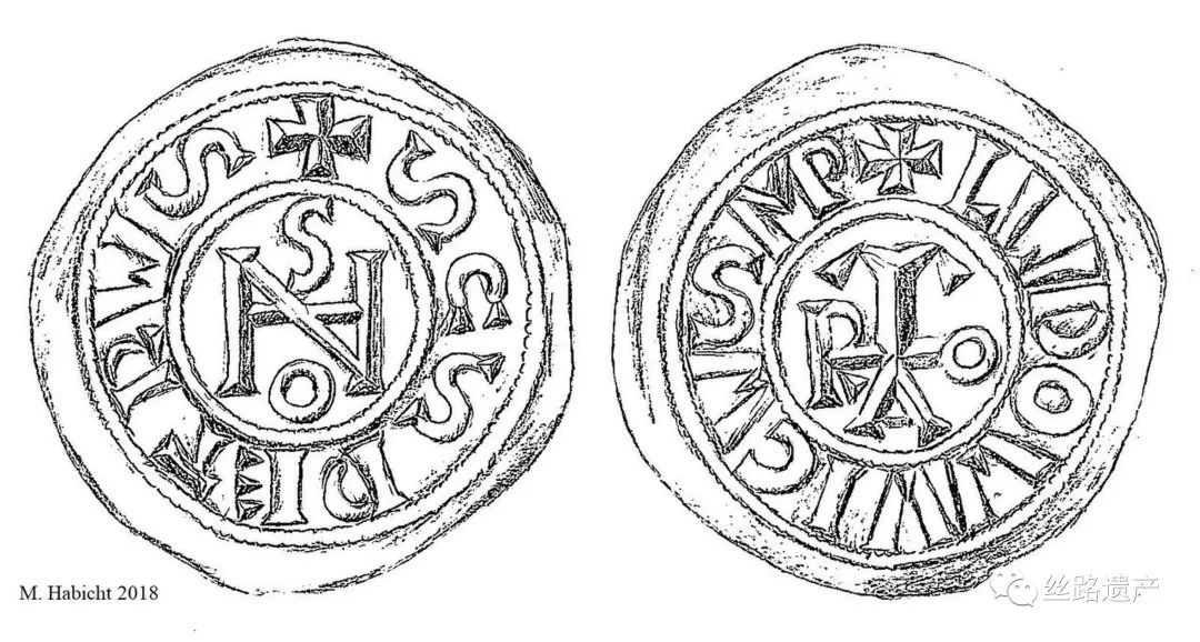这些硬币上一面刻有教皇的名字,很可能是教皇约安,另一面刻着法兰克大帝的名字。